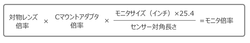 例えば、対物レンズ40倍での観察時、0.5倍のCマウントアダプタを介して1/2インチのカメラを接続し、27インチのモニタに全画面表示した場合のモニタ表示倍率は以下のようになります。