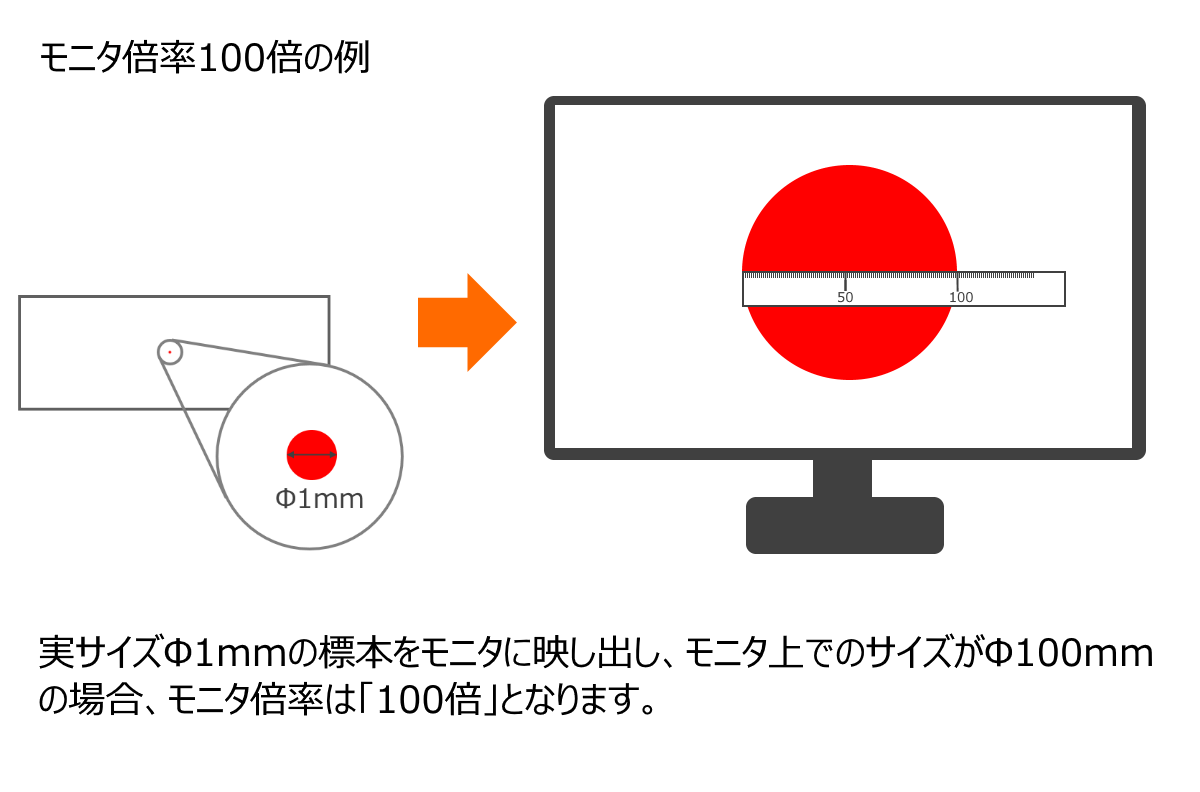 顕微鏡および顕微鏡用カメラにおける「モニタ倍率」とは、その名のとおりモニタ・ディスプレイに表示された際の倍率を指します。