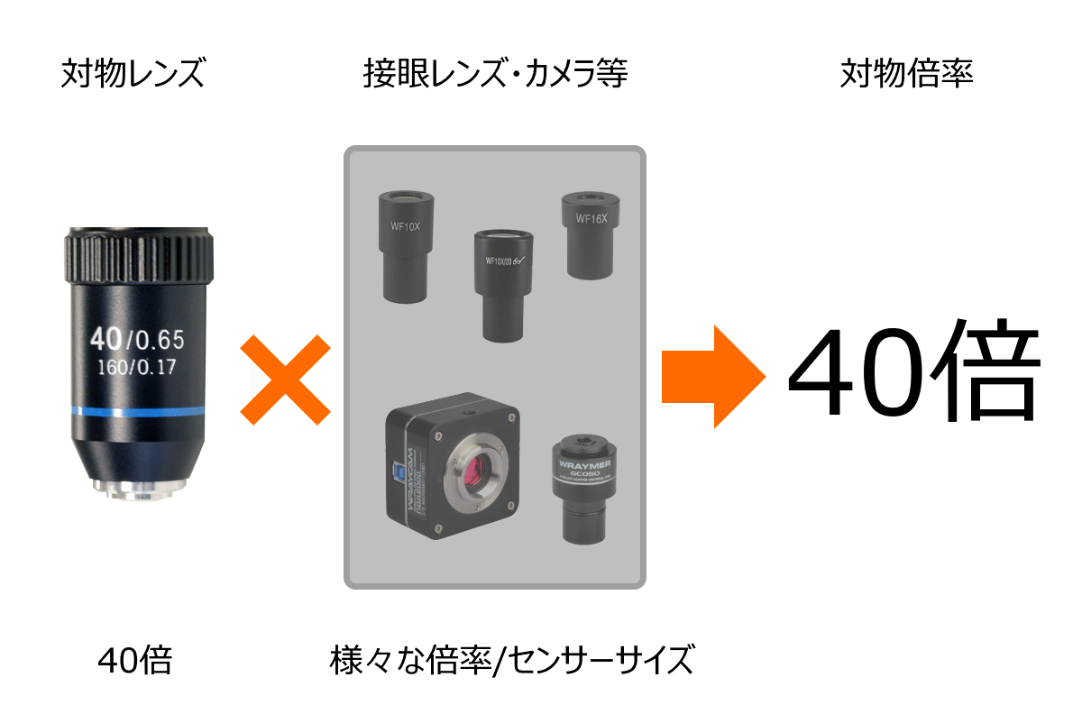 対物倍率は接眼レンズやモニタ等の他要素に左右されないため、接眼レンズ観察時・顕微鏡用カメラでのモニタリング・撮影された静止画等、どのような状況であっても一定の指標として用いることが出来ます。
