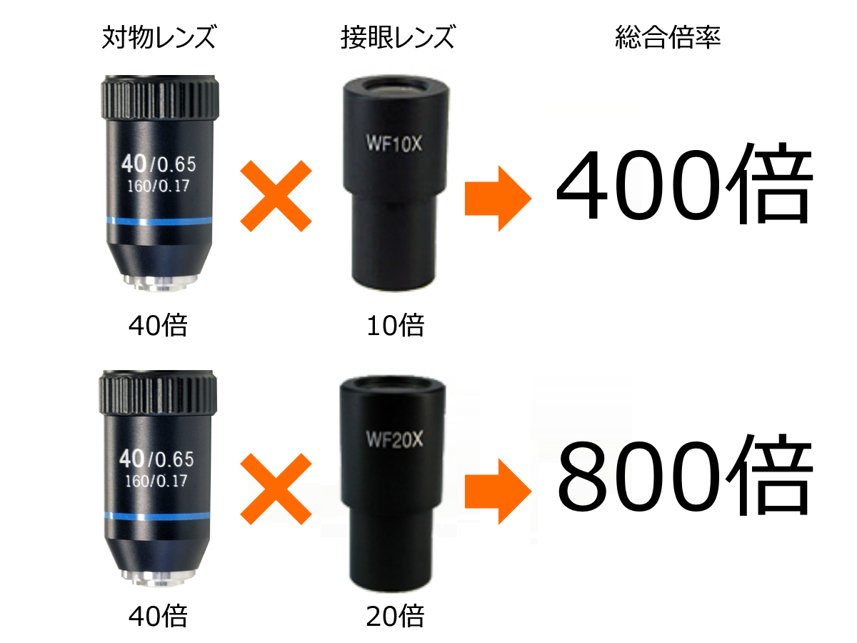 顕微鏡における「総合倍率」とは、対物レンズ倍率と接眼レンズ倍率の積を指します。つまり、生物顕微鏡YX-1500で対物レンズ40倍を用いて観察した場合であっても、倍率10倍の接眼レンズを使用した際は10倍×40倍で総合倍率400倍、倍率20倍の接眼レンズを使用した際は20倍×40倍で総合倍率800倍となります。