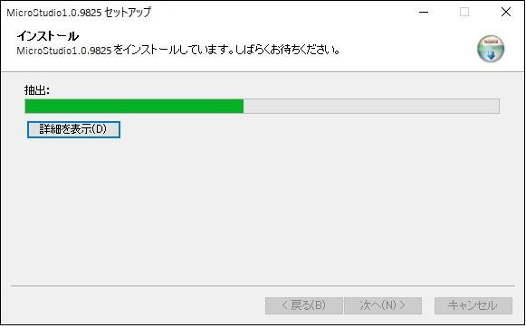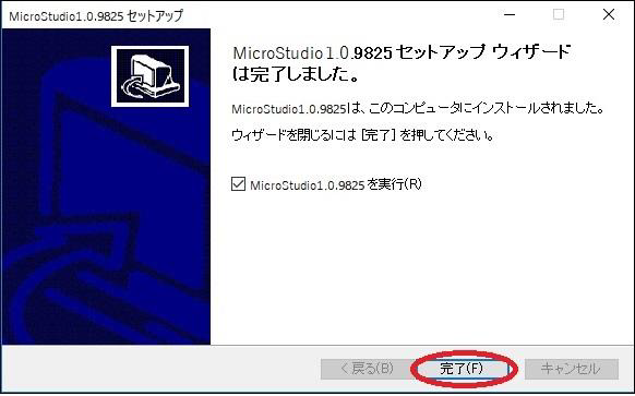 (7)インストールが終了したら、「完了」をクリックします「MicroStudioを実行」にチェックを入れた状態で「完了」をクリックすると、自動的にMicroStudioが起動します。